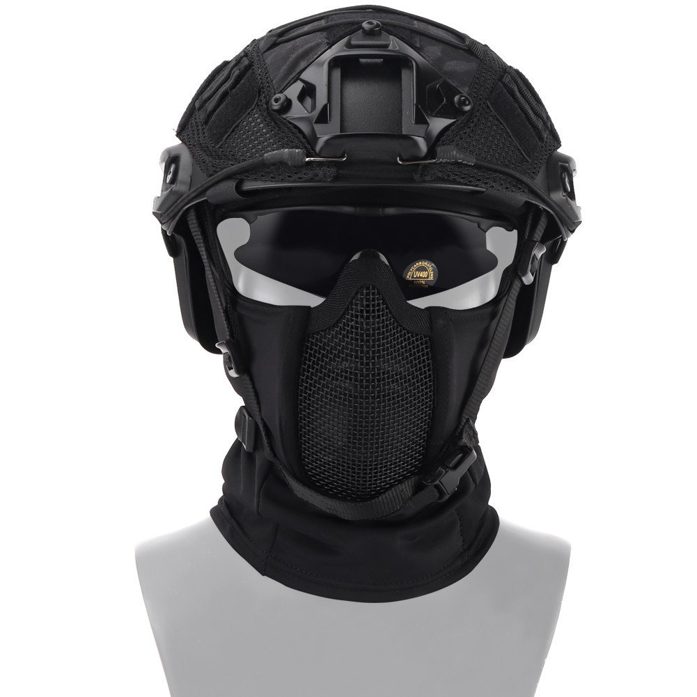 Máscara de airsoft Fighter da Delta Armory, composta por uma máscara de rede e um capuz. Cor Preta