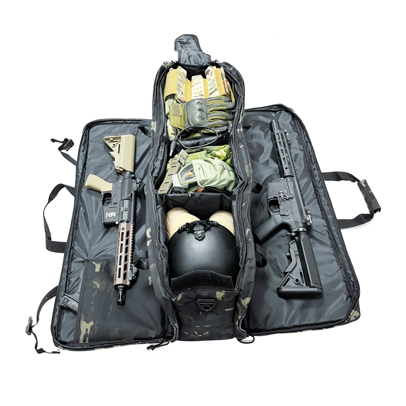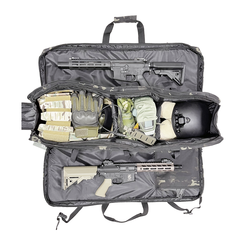 Saco de armazenamento grande para transportar todo o seu equipamento. Possui aberturas laterais para transportar uma arma longa em cada lado e um bolso central grande para guardar capacete, botas, uniforme, equipamento de proteção e consumíveis. Este bolso inclui divisórias modulares.