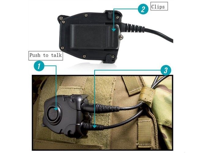Um botão PTT para fones de ouvido equipados com os plugs do tipo militar. O botão é montado no equipamento com o uso de um fixador simples. Suas pequenas dimensões facilitam o uso de bolsos ou bolsas.